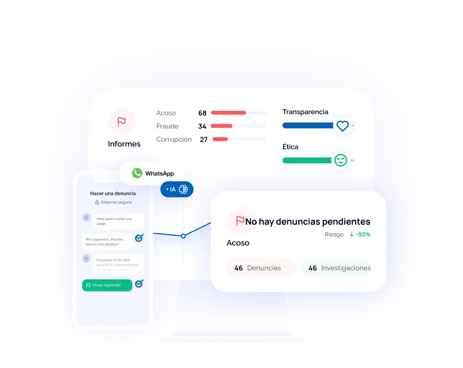 Somos pioneros en el uso de WhatsApp con Inteligencia Artificial para la recepción de denuncias, optimizando procesos y minimizando riesgos corporativos. Nuestras soluciones incrementan la transparencia, reducen el fraude, detectan riesgos, mejoran el clima organizacional y fortalecen los pilares ESG en las empresas.