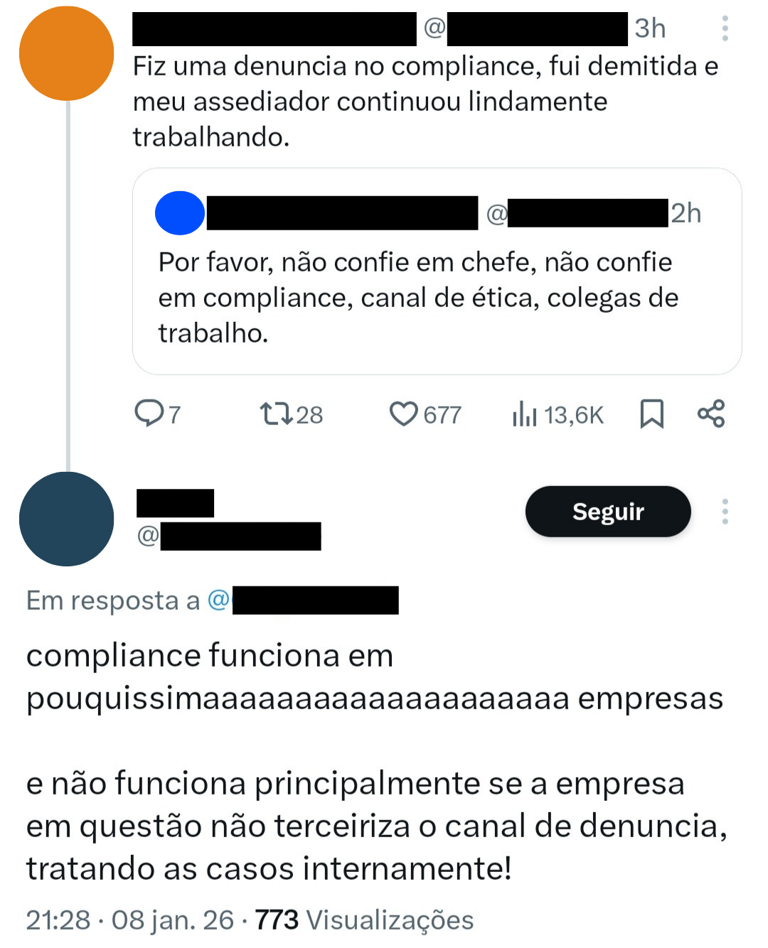 Um post nas redes sociais ganhou destaque ao deixar um conselho duro e revelador: não confiar na chefia, não confiar no compliance, não confiar no canal de ética nem nos colegas de trabalho. A afirmação, por si só, expõe ambientes marcados pela insegurança e pela fragilidade da confiança institucional.